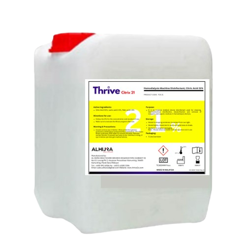The concentration of Citric acid in Thrive Citrix 21 Environmentally friendly hemodialysis disinfectant with peracetic acid as main ingredient which is very stable by using high purity medical ingredient, doesn’t need extra cleaners, is excellent in removing biofilm and calcium carbonate, makes hemodialysis machine management efficient, and is safe to users and economical.